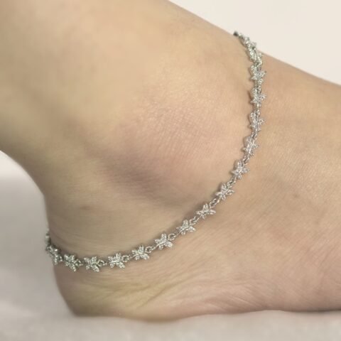Sterling Silver Studded Blue American Diamond Floral Chain White Anklet
