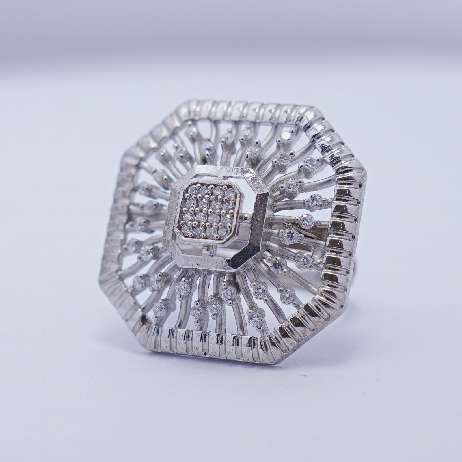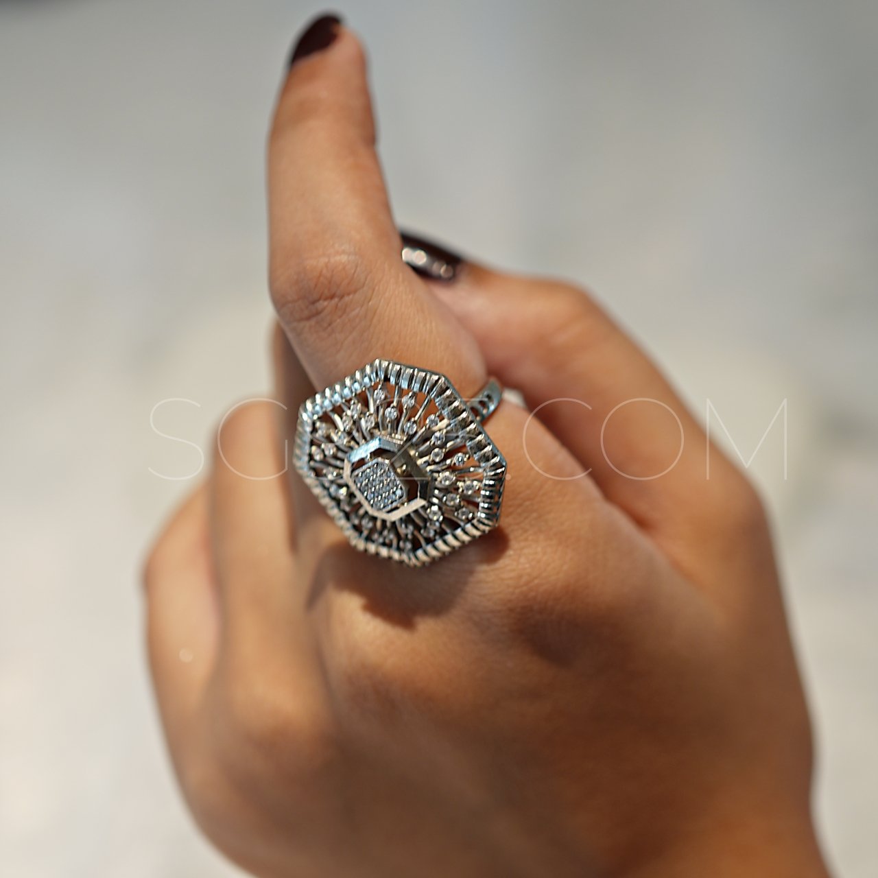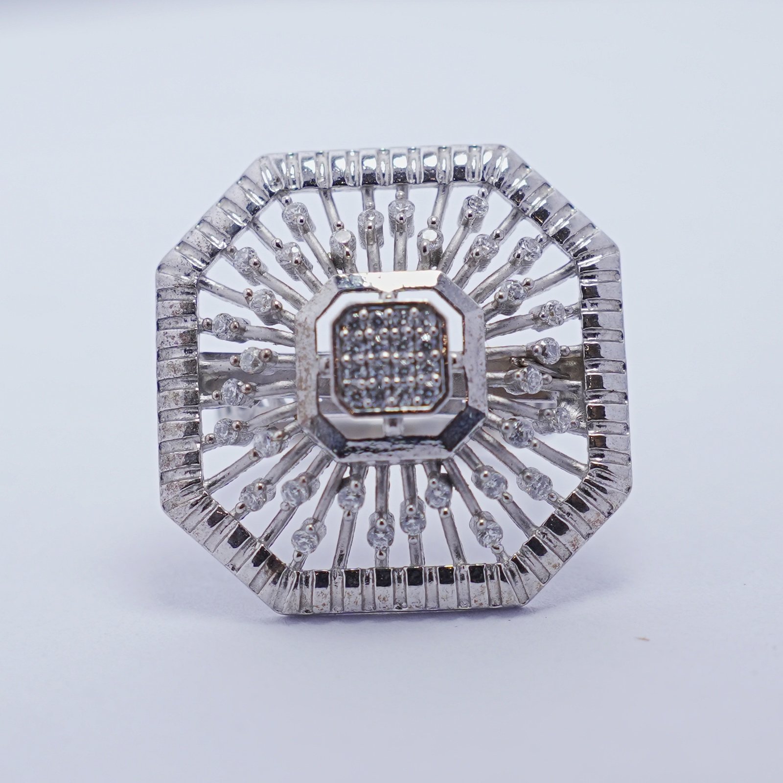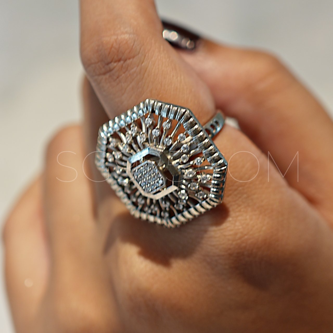Silver Royal Green Cutstone AD Modern Floral Rotatable Ring