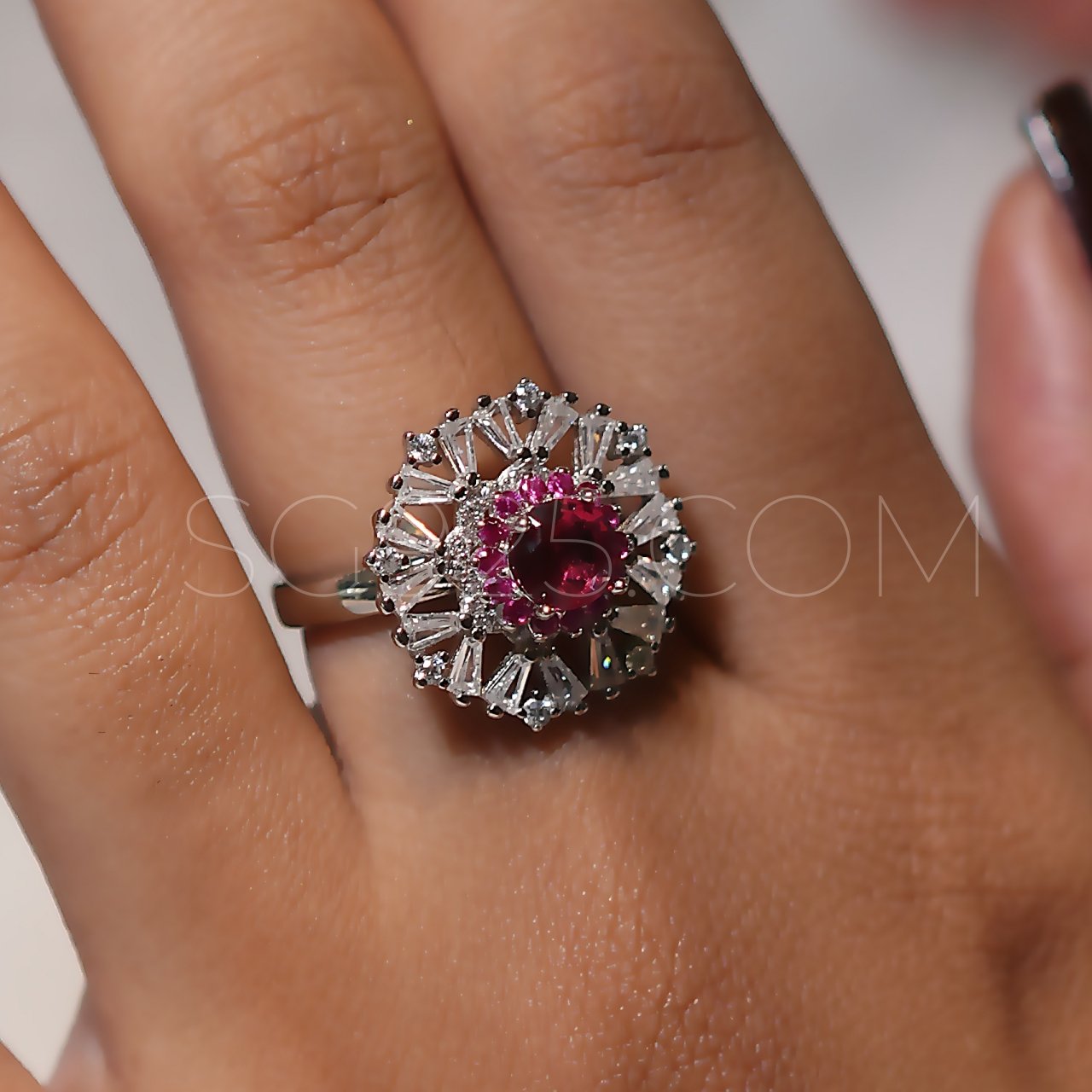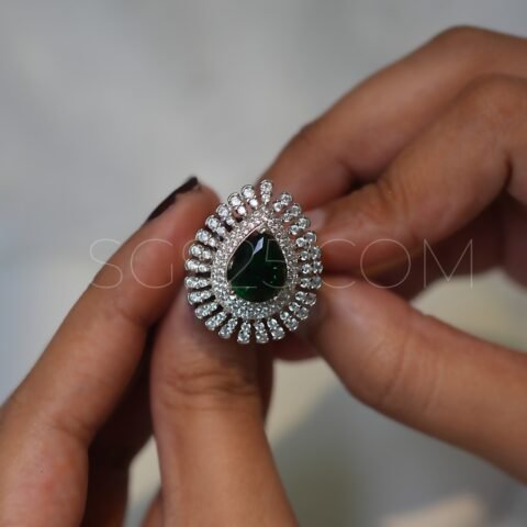 Silver Rich Pink Cutstone AD Modern Floral Rotatable Ring